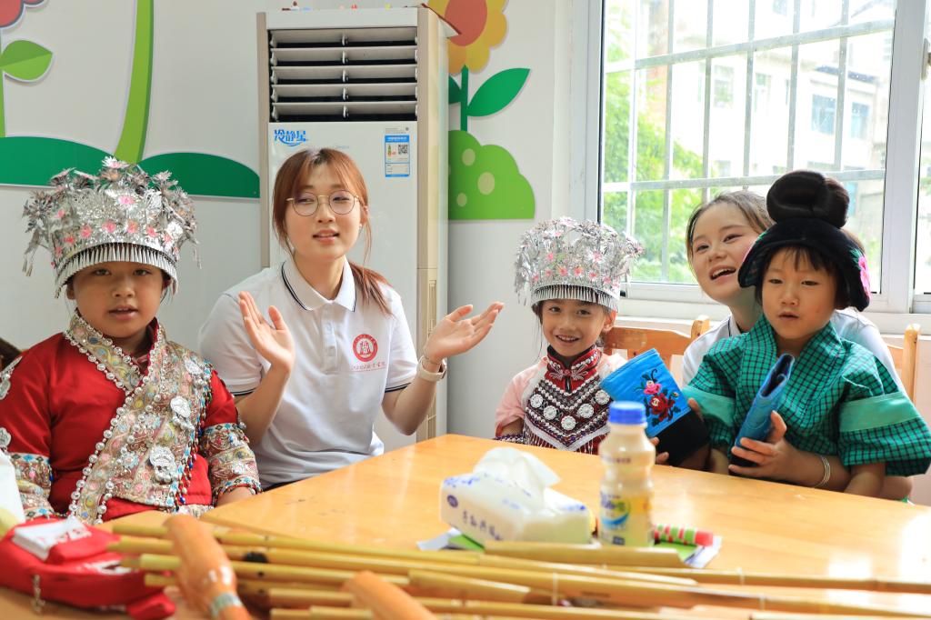 在儿童之家里,苗家阿姐带领实践队员和孩子们学唱苗歌《小小的梯田小小的鱼》。从简单的苗歌片段开始,大家跟着节奏,用虽不熟练却充满热情的歌声应和着。银饰随着歌声轻轻摇曳,童声与成人的嗓音交织在一起,在学唱的过程中,大家不仅领略了苗歌的独特韵味,更在歌声中拉近了心灵的距离。