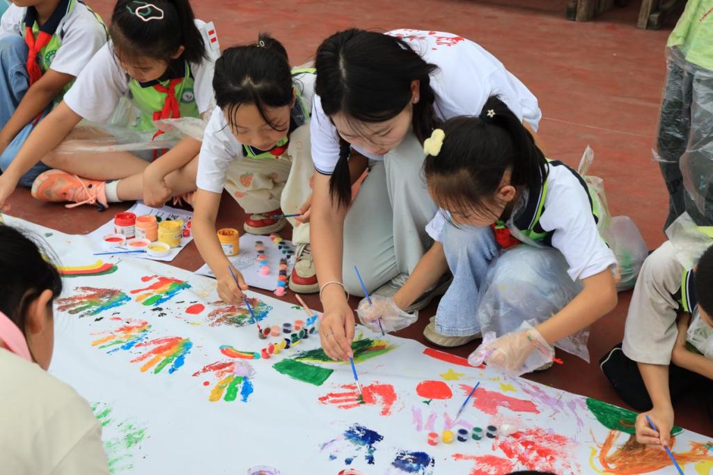 操场上,队员们和孩子们围坐成圈,一边交流着两地特色,一边用画笔描绘心中的美好图景:江西的瓦罐汤与贵州的酸汤鱼相映成趣,南昌滕王阁与荔波小七孔遥相呼应,两地独特的历史故事与民族服饰跃然纸上。孩子们专注地勾勒着每一笔线条,眼中闪烁着对家乡文化的自豪;队员们细心地填充每一处色彩,传递着民族团结的真挚情谊。这幅逐渐成型的斑斓画卷,不仅记录了两地文化的交融,更成为促进民族交流的生动载体。