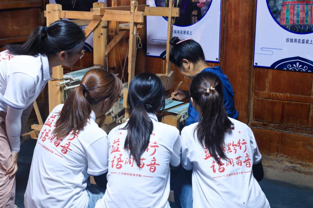 苗锦是中华灿烂织锦文化的有机组成部分。实践队拜访了苗族织锦技艺国家级代表性传承人潘英,深入学习这项非遗技艺。潘老师向队员们展示了精美的织锦作品,上面的蝴蝶、祥文等图案栩栩如生。她特别拿出一件珍贵的传家宝:“这是我奶奶年轻时亲手织的,已经有120多年历史了。从种棉、纺线到染色织造,每道工序都是奶奶亲手完成的。”在古朴的织机前,潘老师娴熟地示范织锦技法,双脚灵活踩踏,双手快速穿梭。跃跃欲试的队员们初次尝试时却手忙脚乱,丝线很快缠成一团。潘老师立即上前指导:“握梭要稳,穿梭要准,还要注意观察经线排列。”经过耐心指点,队员们慢慢体会到这项非遗技艺“慢工出细活”的真谛。