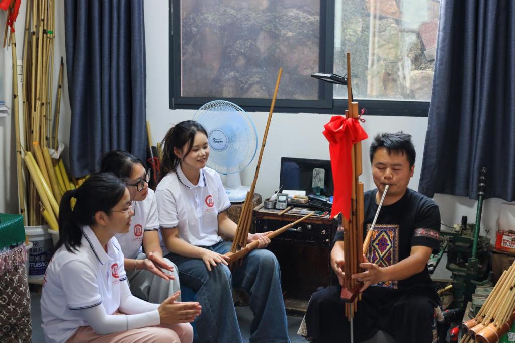 实践队专程拜访了第十二代芦笙制作传承人罗志泽老师,深入学习芦笙制作的精湛技艺。罗老师详细讲解了选材的关键:制作笙斗需选用防腐防潮的杉木,而笙管则必须采用可食用且音质清亮的苦竹,竹节间距需均匀圆润。他还向队员们展示了九种不同芦笙的特点,从形制差异到适用场合,再到背后的文化内涵,一一细致讲解。罗老师不仅积极传承还不断创新,成功研制出十九音芦笙,将现代审美与传统工艺相融合,使这一古老乐器不仅活跃于苗寨节庆,更登上更广阔的舞台,成为连接民族文化与世界的纽带。