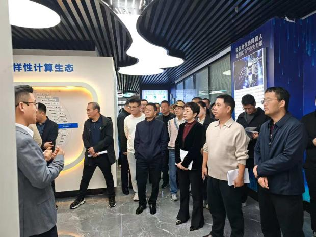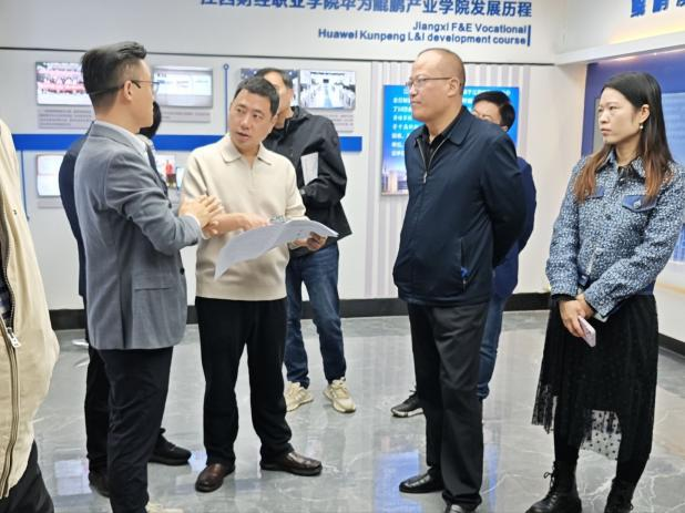 调研组一行参观了鲲鹏产业学院的中心展厅、人才交流中心等地。通过动态数据屏与立体展示墙,系统了解鲲鹏产业学院紧扣国家数字经济战略、打造"政校企"协同创新平台的成长轨迹。产业学院以特色课程为基、行业优势为翼,通过产学深度融合、校企精准对接,构建起"培养-就业-创业"全链条服务体系。调研组在现场不时与产业学院负责人展开深度研讨,交换意见建议。大家纷纷表示,江西目前正全力深化职业教育改革,高职院校作为人才培养的重要阵地,要紧密把握区域发展战略和地方经济发展脉搏,主动对接产业发展需求,走出一条依托地方经济、服务地方经济,深化产教融合、科教融汇的特色发展道路。