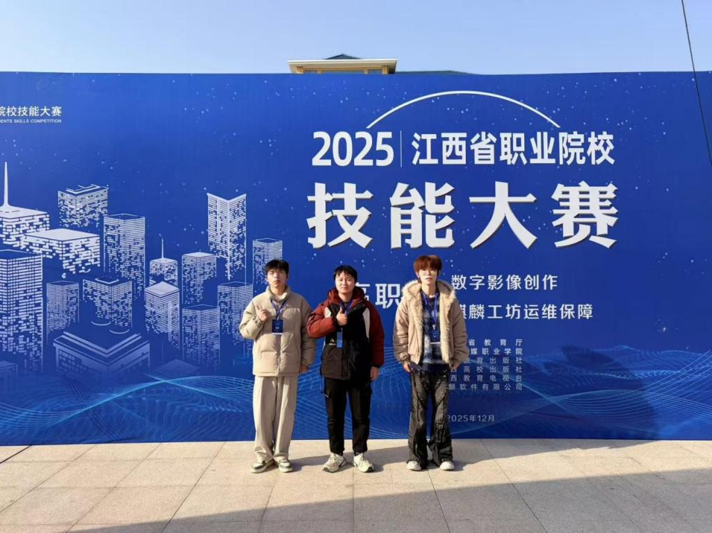 2025年12月14日,江西省职业院校技能大赛数字影像创作赛项在江西传媒职业学院圆满落幕。本次赛事吸引了全省各职业院校的28支优秀队伍同台竞技,工商管理学院学子左金龙、蒋云松、刘强代表学院首次参赛,在黄博文、钟思两位指导教师的悉心指导下,凭借扎实的专业功底、出色的实践能力和默契的团队协作,在激烈角逐中脱颖而出,最终斩获三等奖。