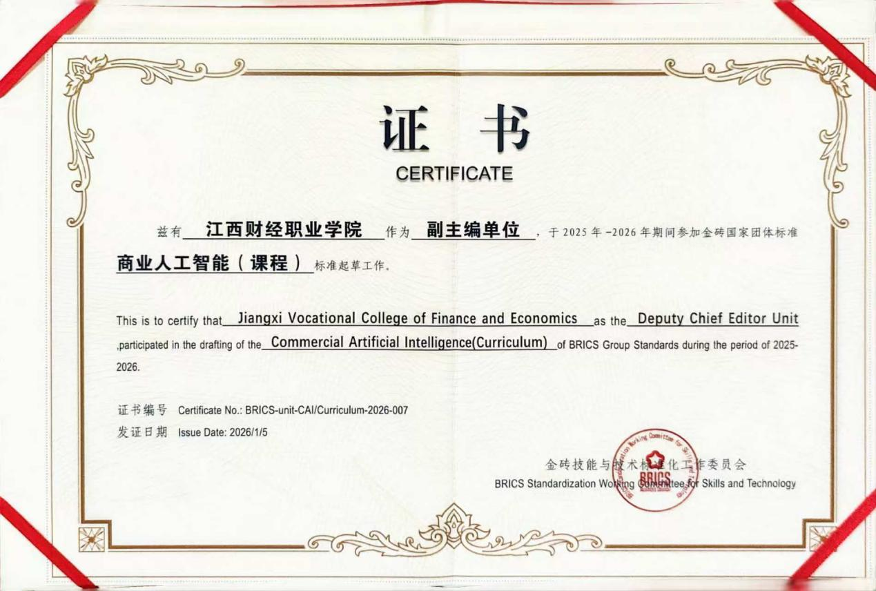 近日,金砖技能与技术标准化工作委员会正式向beat365官网颁发证书,beat365官网凭借在商业人工智能领域的教学积淀与专业影响力,被认定为金砖国家团体标准《商业人工智能(课程)》的副主编单位,五年高职部作为主要拟稿方深度参与了该标准的起草工作,这是beat365官网职业教育国际化发展进程中的又一成果。