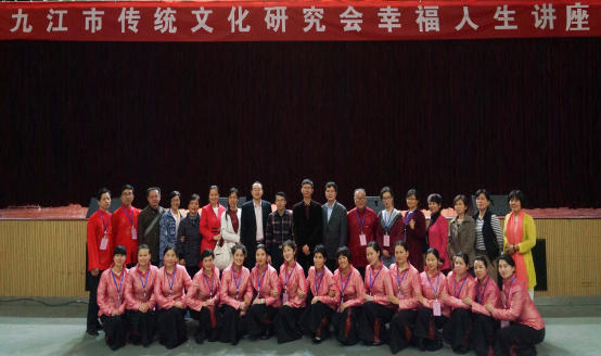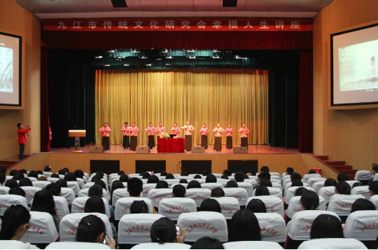 本场传统文化教育活动,内容丰富、形式生动活泼,在传统文化教育讲座正式开讲之前九江传统文化研究会的女义工们走上舞台为在场师生表演了具有传统文化韵味的歌舞节目《生命之河》。在讲座结束后研究会成员和在场师生同声歌唱爱国歌曲《歌唱祖国》。