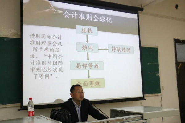 讲座从三个方面展开,首先从经济时代背景介绍了我们国家会计准则的制定正处于从局部等效走向全面等效的阶段,并结合“什么是会计”、“何为借贷”等问题并进行了专业的分析;接着,从会计的含义、账务的处理程序、财务与会计的关系、会计信息的使用者、会计要素计量属性等方面,结合一些具体生动的案例进行阐述;最后就如何学好会计学专业进行了引导并提出许多合理化建议,李宁教授强调说,新入门的同学们,要从现实生活的角度着重培养对会计学的兴趣,拥有广阔的视野,学会思考,做一位全方位的会计应用型人才。
