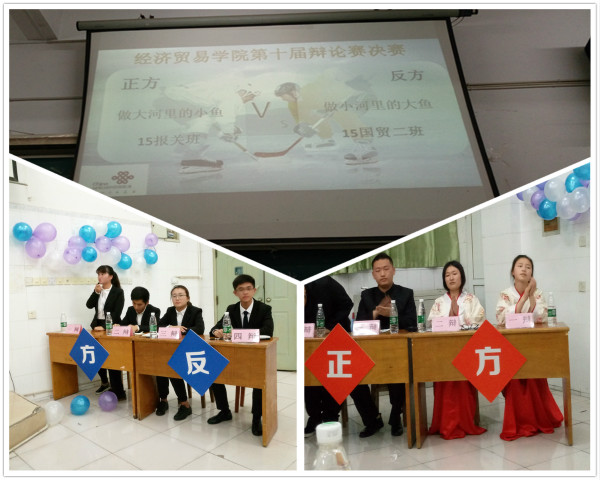 在冠亚军争夺赛开赛前,主办方首先以PPT的形式展示了此次辩论赛的全过程,紧接着15报关班代表队和15国贸2代表队以“做大河的小鱼还是小河的大鱼”为辩题展开了冠亚军争夺赛,攻辩双方以超强的案例说服力和自身的辩论感染力赢得评委及同学们的肯定。特邀嘉宾对两队表现做了精彩的点评。赛后,崔晓慧老师以要做一只不断成长的鱼为题对整场比赛进行了点评,并对双方选手的表现给予了充分肯定。