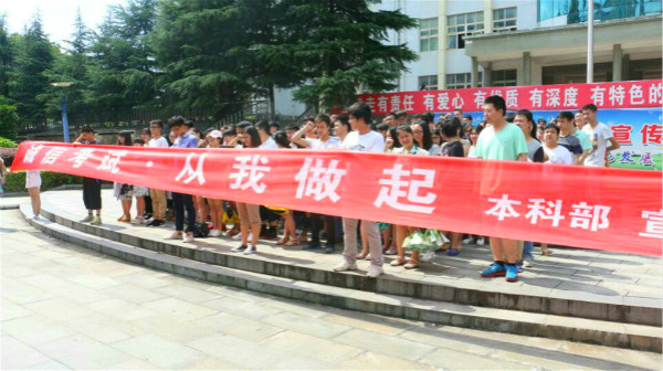 孟子有云:“车无辕而不行,人无信则不立”。为进一步树立良好学风,严肃考风考纪,营造严谨求实的学习氛围,培养学生的诚信品德,维护公平公正的考试秩序。期末考试来临之际,本科部学生党支部本着“两学一做”基础在学、关键在做,每个党员必须学在经常,做在日常的态度,6月21日上午开展了系列活动三之“诚信考试·从我做起”签名宣誓活动。