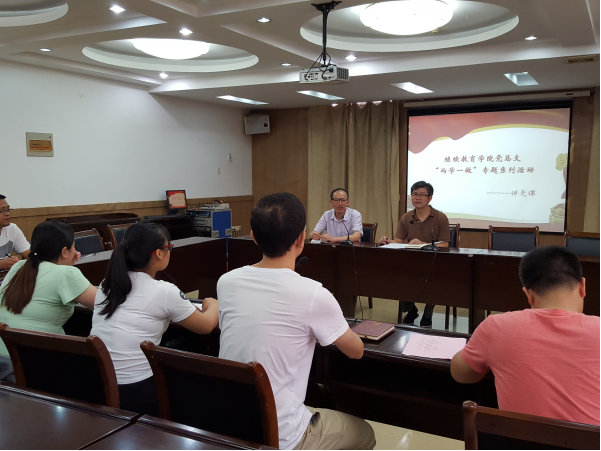 6月23日下午,为贯彻落实校党委“两学一做”学习教育的精神和工作要求,继续教育学院党总支书记吕建斌在培训中心二楼会议室讲党课,beat365官网全体教师党员、学生党员出席活动。