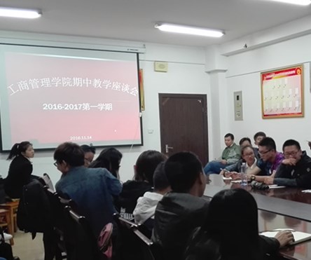 为进一步规范教学管理,及时了解教学动态,切实提高教育教学质量,11月14日晚,工商管理学院在综合楼903办公室召开2016-2017学年第一学期期中教学座谈会。院长冯弋江教授、院党总支书记胡红霞教授、武丹副院长、各教研室主任、相关专业教师和各班学生代表参加了座谈会。