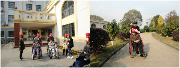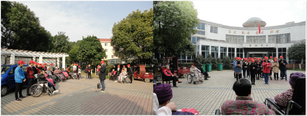 有的搀扶老人或推着轮椅带老人到室外散步、晒太阳,并与老人们一起唱歌。
