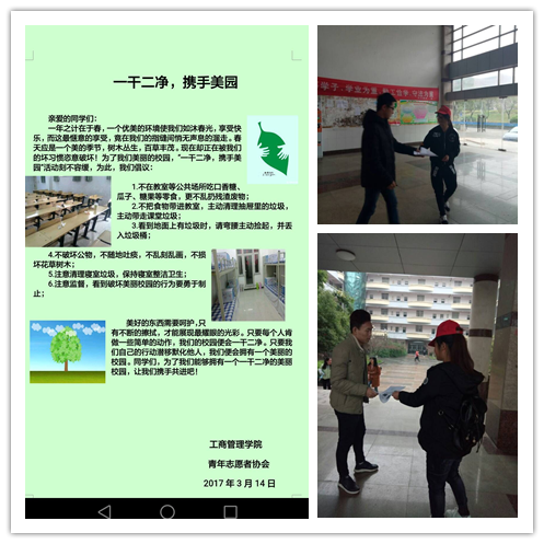 美化校园环境,从你我做起,从文明习惯养成做起。在清扫教学楼后,志愿者们手持一张事先精心制作的、标题为“一干二净,携手美园”的宣传单,热情地向同学们分发,积极呼吁更多的同学加入到校园环境保卫活动中。