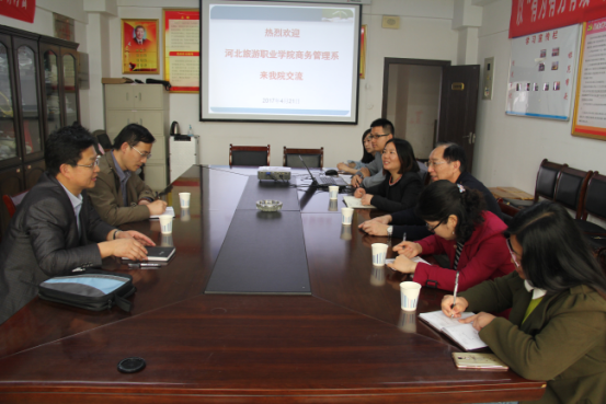 4月21日上午,河北旅游职业学院商务管理系主任张成龙、教研室主任杨永峰来beat365官网进行交流研讨。武丹副院长热情接待了张主任一行,并在综合楼903办公室召开了市场营销专业建设与教学改革交流研讨会。经济贸易学院院长吴炜教授、市场营销教研室主任易娇艳、钟思、黄文君等老师参加了会议。