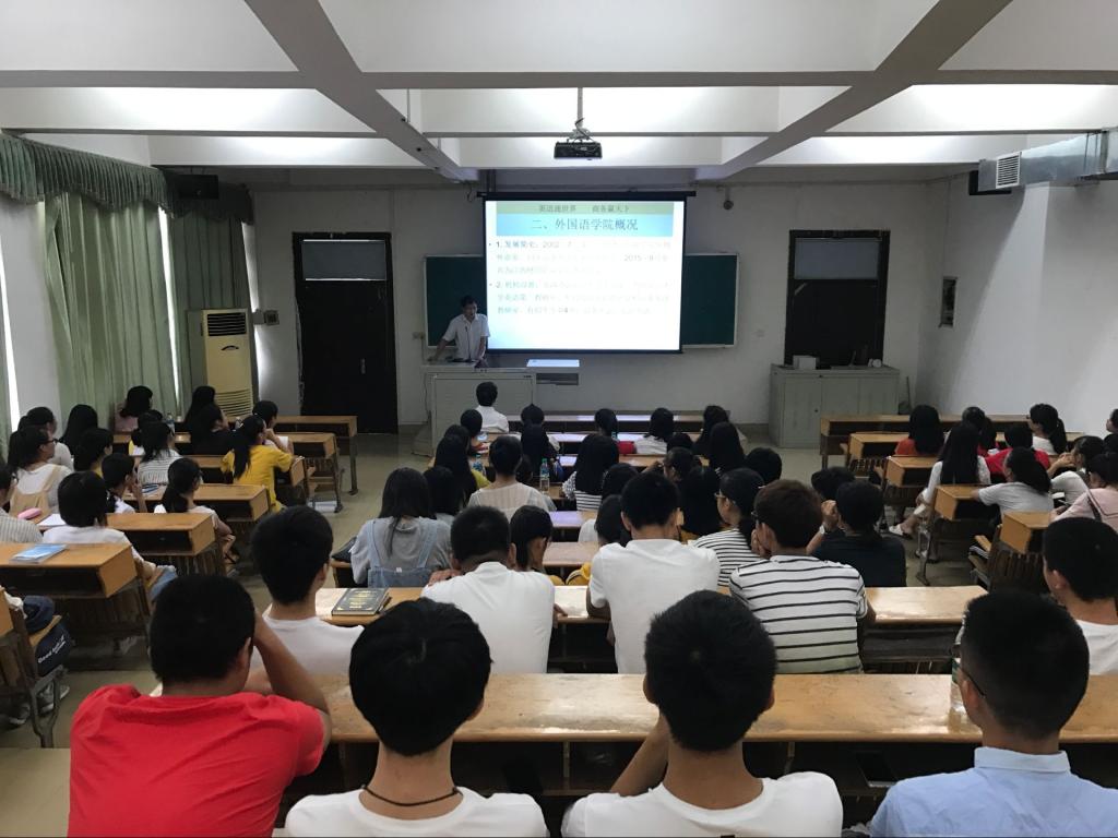 9月4日上午,外国语学院在综合楼阶梯教室(一)举行2017级新生开学典礼。外国语学院院长王胜华、党总支书记何平滚、党政办公室主任欧阳倍祥及新生班主任业方琼和叶吟桐参加典礼。活动由欧阳倍祥主持。