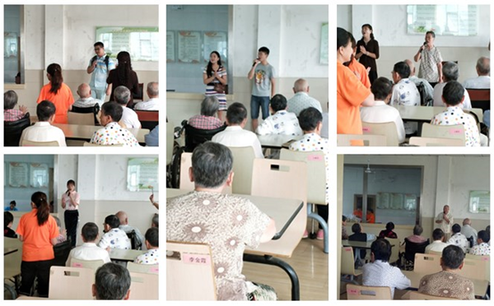 来到福利院后,同学们将老人们从房间搀扶到福利院的餐饮中心,将带去的水果分发给老人们,并向老人们表演了精心准备的节目。在《北京的金山上》、《澎湖湾》、《映山红》等老人们熟悉的歌曲和旋律的带动下,一些老人也兴味盎然地加入进来,带来了京剧及手语表演。整个现场掌声不断、笑声不断,为平日宁静的福利院增添了许多欢声笑语。