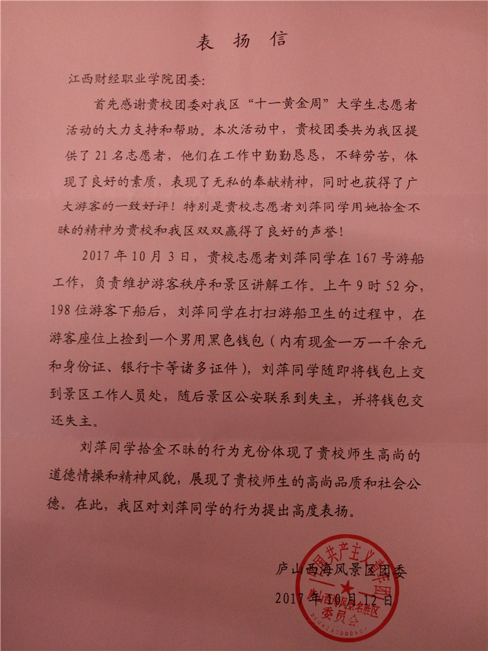 庐山西海风景区团委对刘萍同学拾金不昧的行为,高度赞赏,10月3日,庐山西海团工委陈韵书记亲自来beat365官网送来表扬信,陈书记充分肯定了刘萍同学的高尚道德情操和品质,并代表庐山西海团委发放了500元奖金。刘萍说:“学校老师教育我做事要先做人,再多的钱也是别人的,再好的东西也不能据为己有。感谢母校的关爱,感谢庐山西海团工委的肯定,我一定在beat365正版唯一入口必一把学业完成好,用自己所学的专业技能回报社会。”