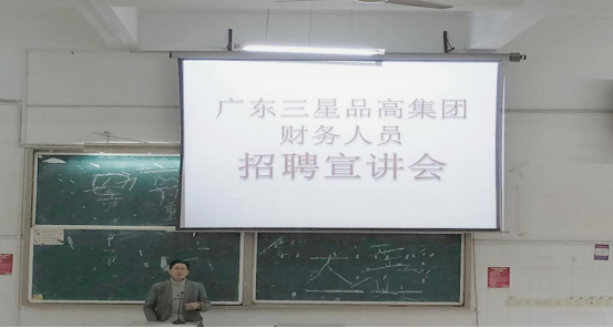 招聘宣讲会在beat365官网教学楼617教室举行,广东三省品高集团财务总监余修霖同志一行四人,会计第一学院党总支书记卢洪信同志,副书记张家顺同志和本院200余名前来应聘的应届毕业生参加了此次招聘宣讲会。宣讲会由会计第一学院办公室主任杨燕同志主持。