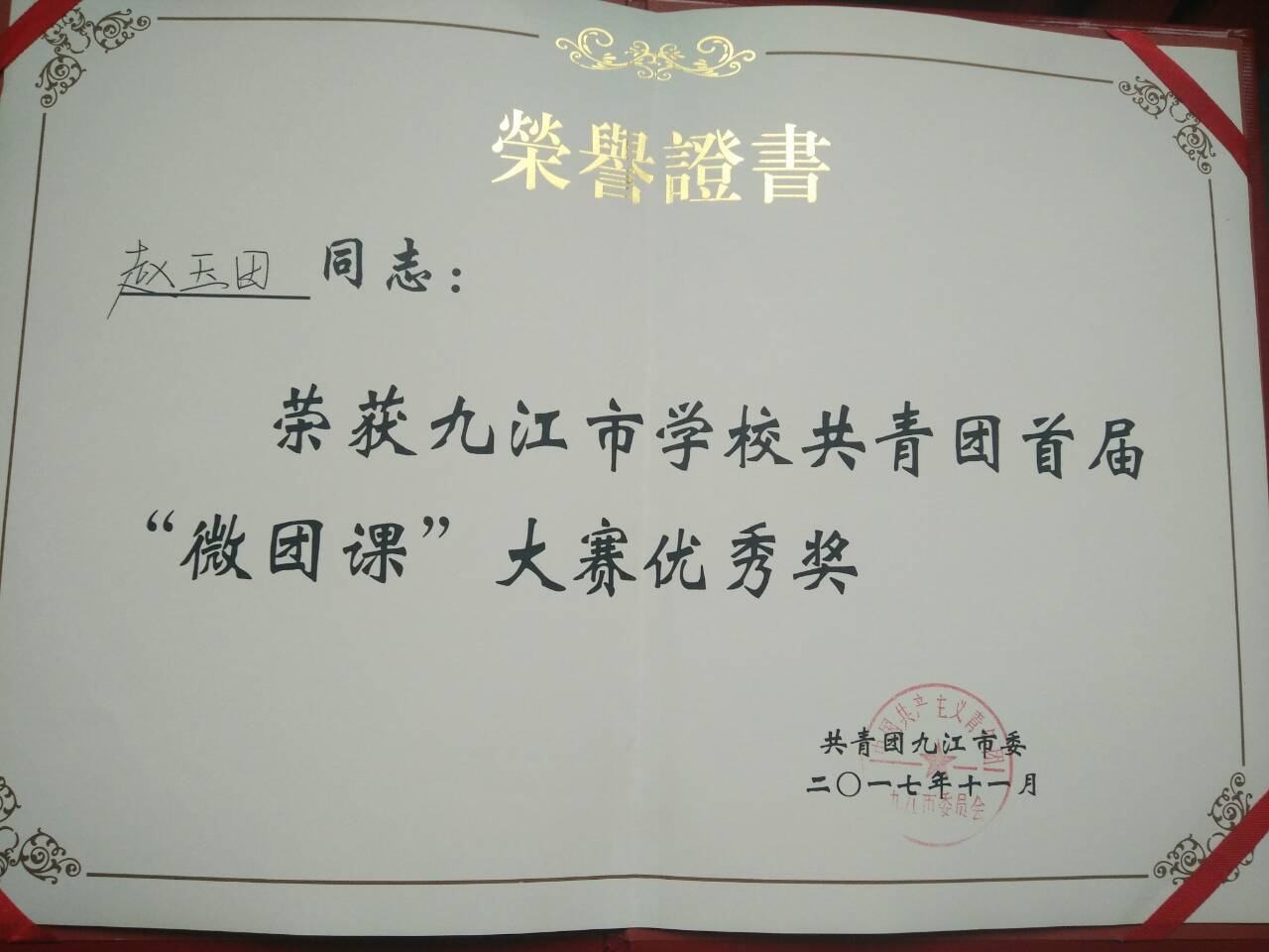 赵玉田同学以“青春献礼十九大,团青共铸中国梦”为主题在九江职业技术学院濂溪新校区二号实验楼学术报告厅进行微团课现场决赛,决赛中,每位参赛选手进行10分钟的现场授课。从学习马克思列宁主义、毛泽东思想、中国特色社会主义理论体系、学习习近平总书记系列重要讲话精神;开展中国特色社会主义共同理想和共产主义远大理想教育,加强社会主义核心价值观教育和“中国梦”教育;学习党的基础知识、党的光荣历史和传统,宣传党的路线、方针、政策,学习团章、团史、团的基本知识、团的重要会议精神和重点工作部署;学习中华优秀传统文化、革命文化和社会主义先进文化;广泛开展近代史、现代史教育和国情教育,开展好民主和法制教育等其他相关主题知识,综合运用歌曲、视频、多媒体等方式和方法,为大家讲一场生动的团课。最终获得优秀奖。