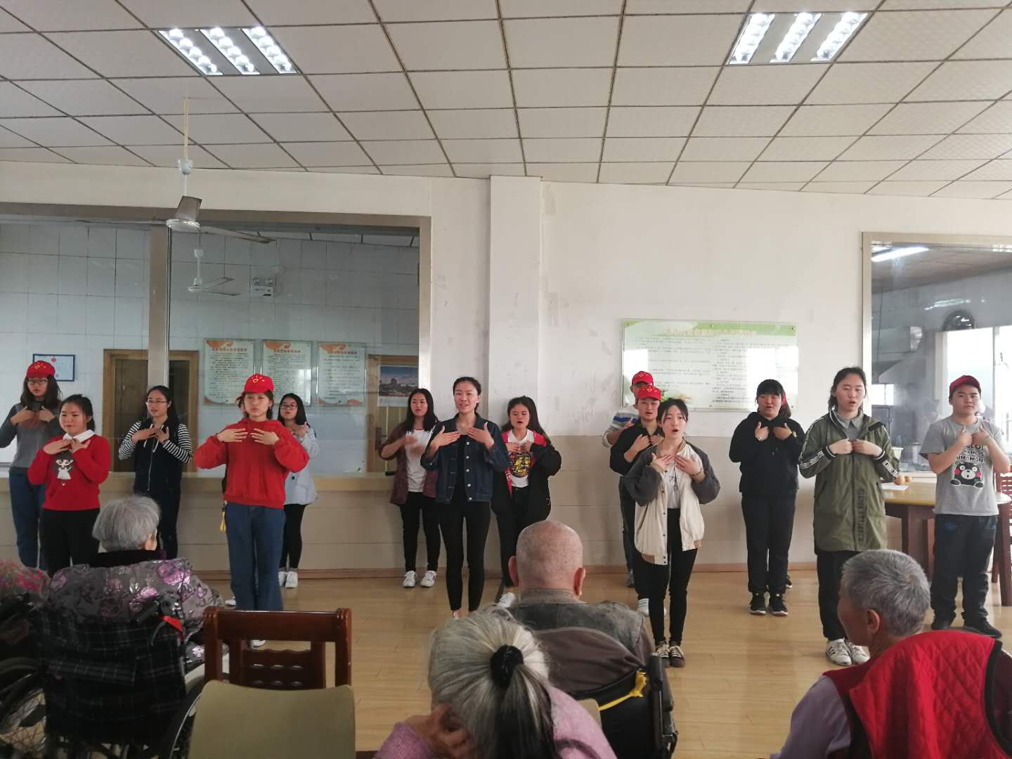 志愿者们来到了敬老院和老人们聊天,送去了纯真的关怀和温馨的祝福。在敬老院里,志愿者们还为老人们表演了自己精心编排的节目,爷爷奶奶们看着这群青春活泼的娃娃们,开怀大笑,不时地传来阵阵掌声。随后,老人们也展示了他们的才艺表演,整个敬老院到处都洋溢着快乐、和谐的气氛。