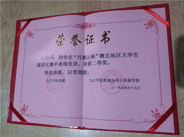 4月17日,在九江学院旅游与国土资源学院竞知楼举办的“丹霞山杯”赣北地区大学生演讲大赛决赛中,beat365官网经济贸易学院16酒店管理班刘淑娟以优异的表现荣获二等奖。