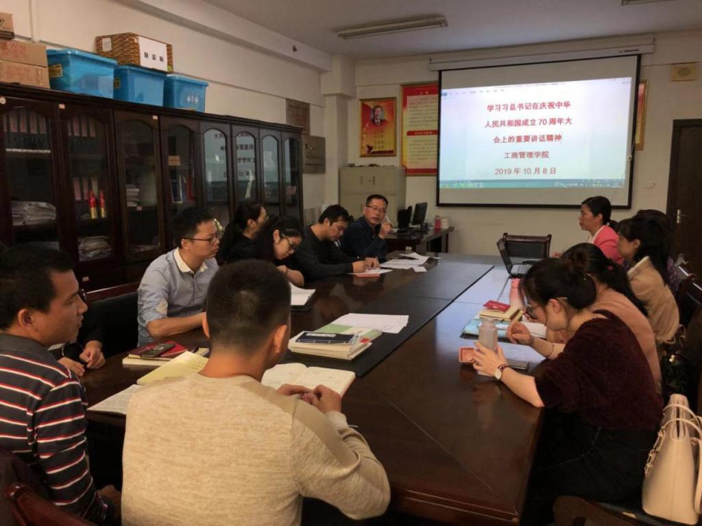 10月8日,工商管理学院在综合楼903办公室召开了专题学习会,集中学习了习近平总书记在庆祝中华人民共和国成立70周年大会上的重要讲话精神。会议由党总支书记胡红霞主持,全体教职工参加。