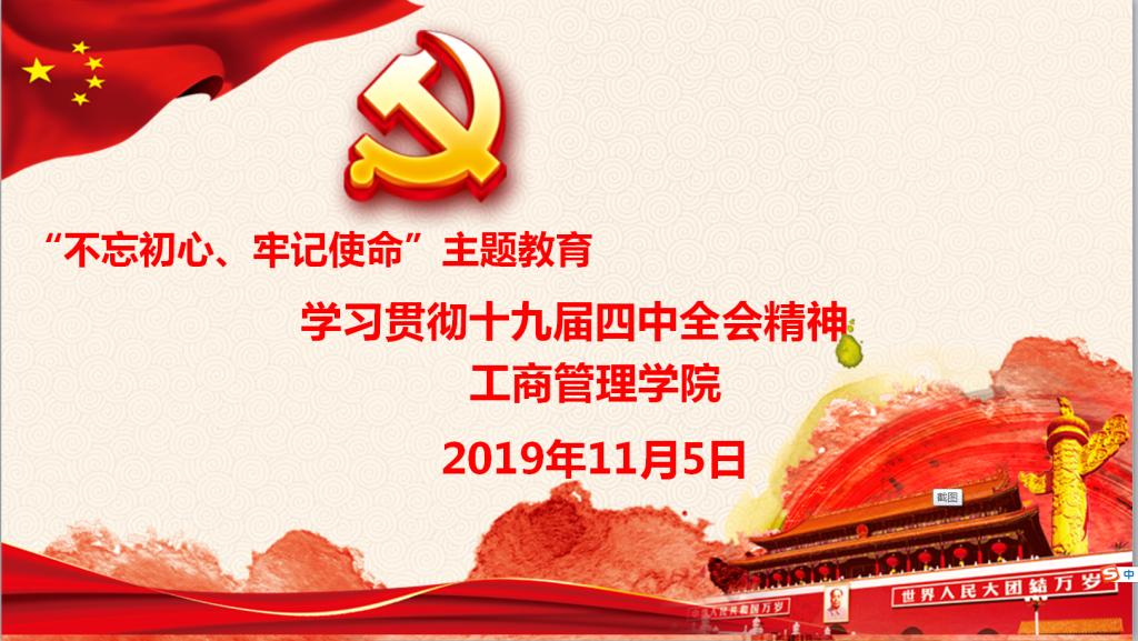 根据习近平总书记在“不忘初心、牢记使命”主题教育工作会议上的重要讲话精神,为牢牢把握“不忘初心、牢记使命”主题,持续推进“两学一做”学习教育常态化制度化,深入学习贯彻习近平新时代中国特色社会主义思想,工商管理学院于11月5日在综903会议室组织全体教职工学习党的十九届四中全会精神,会议由党总支书记胡红霞同志主持。