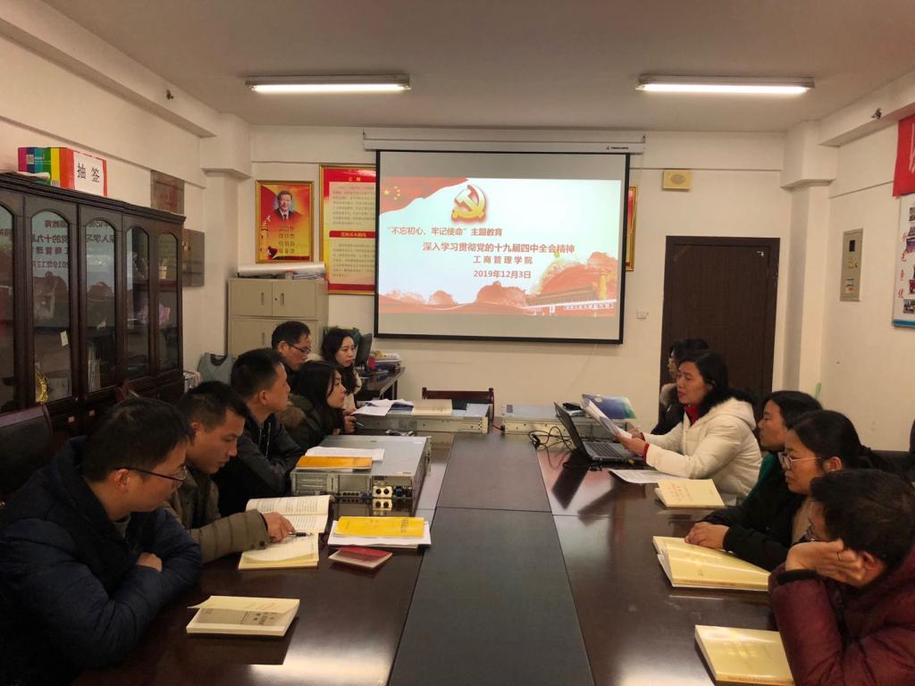 根据学校《关于在第二批“不忘初心、牢记使命”主题教育中认真学习贯彻党的十九届四中全会精神的通知》要求,为充分认识学习贯彻党的十九届四中全会精神的重大意义,把深入学习贯彻党的十九届四中全会精神贯穿于主题教育中,工商管理学院党总支于12月3日在综903室组织全体党员同志就贯彻党的十九届四中全会精神开展专题集中研讨,会议由胡红霞同志主持。