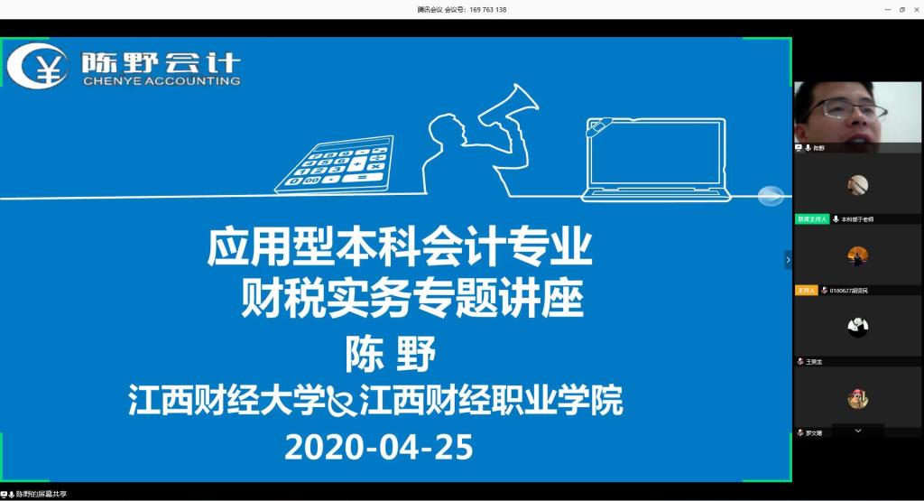 为使应用型本科生更深入掌握和运用专业知识,着实提高实践操作能力,2020年4月25日,本科部诚邀全国职业教育专业委员会专家导师、国家注册税务师陈野老师,通过腾讯会议平台举办了财税实务专题讲座。本科部2018级全体学生及本科部部分老师参加。