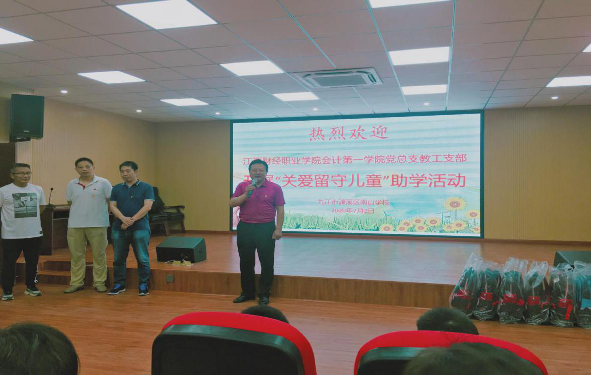 为纪念中国共产党成立99周年,结合学院2020年上半年党建活动计划,7月2日,会计第一学院党总支教工党支部党员老师前往九江市濂溪区南山学校,开展“关爱留守儿童”助学活动。向留守特困小学生捐赠了书包、学习体育用品和防疫爱心包,给留守儿童送去温暖和关爱。