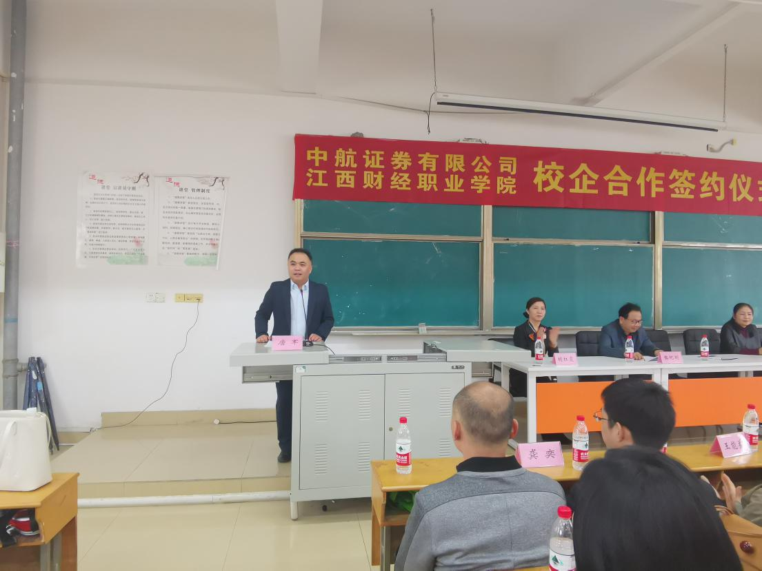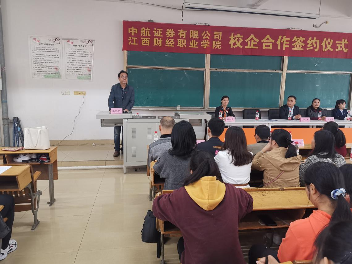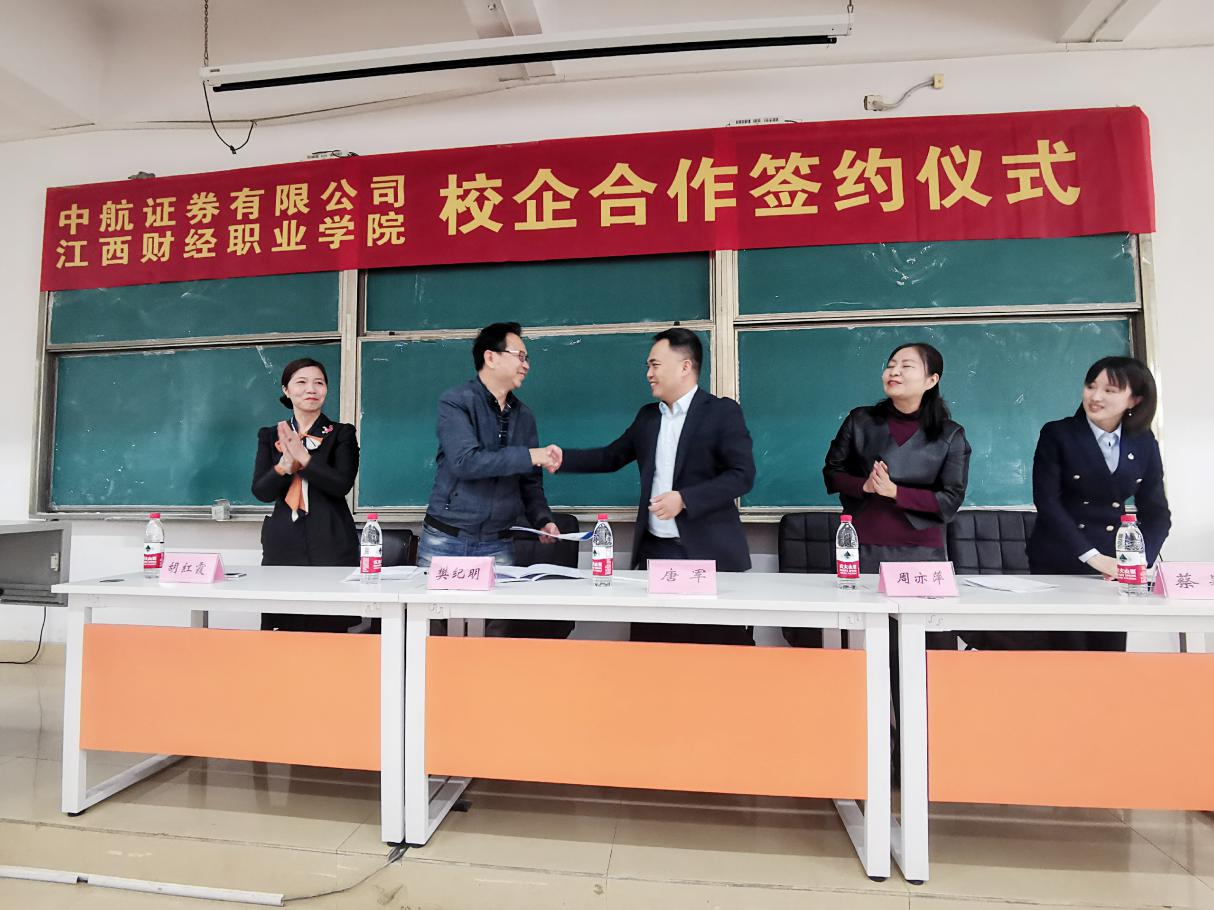 10月25日下午,beat365官网与中航证券有限公司在校综合楼综阶六教室举行校企合作签约仪式。出席签约仪式的有中航证券有限公司南京分公司总经理唐军、投教中心负责人蔡颖、九江营业部总经理周亦萍及公司其他管理人员,学院樊纪明院长、胡红霞书记、王怡然副书记及学院其他教师。仪式由梁丹老师主持,金融管理、保险、投资与理财、证券与期货、互联网金融专业学生参加签约仪式。