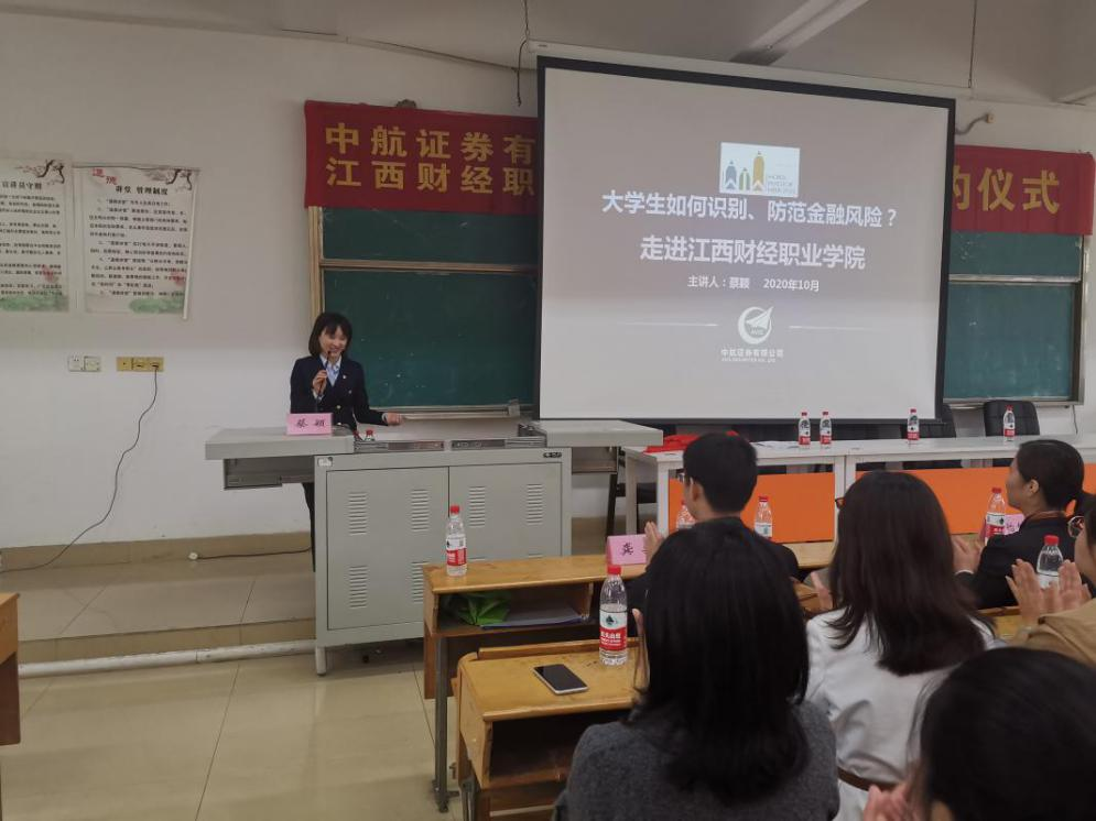 蔡老师首先对中航证券有限公司(以下简称“中航证券”)进行了介绍,并指出中航证券是中国军工央企集团所属唯一证券公司。随后,她以金融电信诈骗、非法校园贷、非法集资等鲜活案例,重点讲解了如何避免、防范金融电信、非法校园贷、非法集资等各种诈骗的方法和措施,提高了师生对各种金融风险的认识和安全防范意识,受益匪浅。