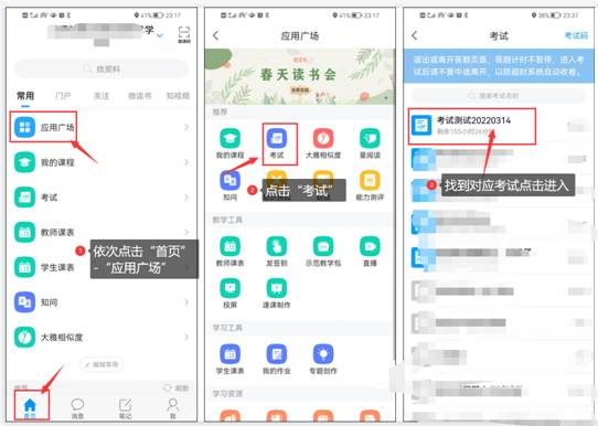 第三种:通过依次点击“首页”-“应用广场”-“考试”,找到对应考试,点击进入