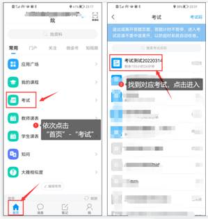 第二种:学习通首页点击依次点击“首页”-“考试”,找到对应考试,点击进入。