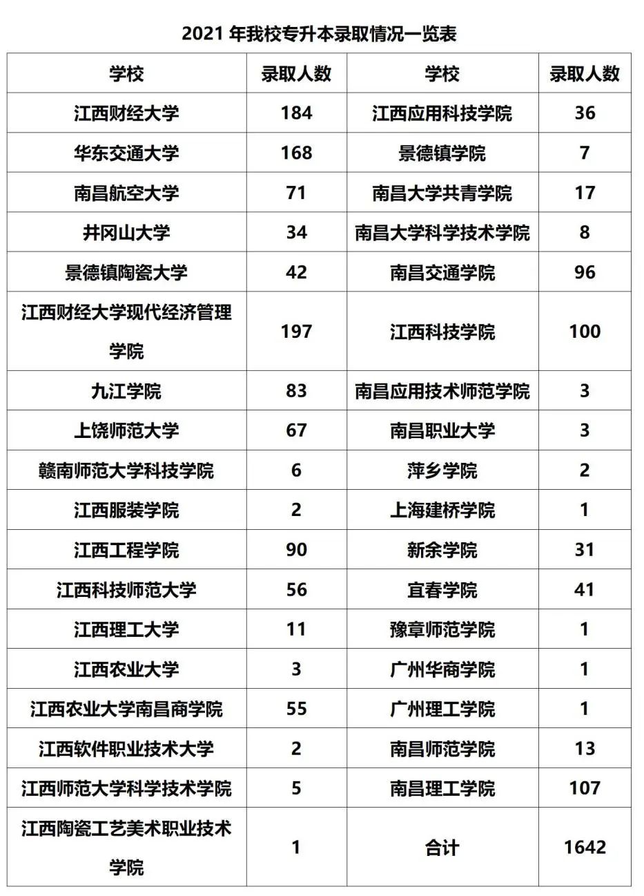 beat365官网2021年参加专升本考试的毕业生为2100人,最终被江西财经大学、江西农业大学、华东交通大学、南昌航空大学、江西科技师范大学等省内各普通本科高校录取共计1642人,录取率高达80%,录取人数再创历史新高,升本人数和升本率位居全省前列。