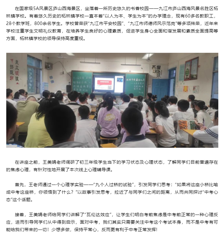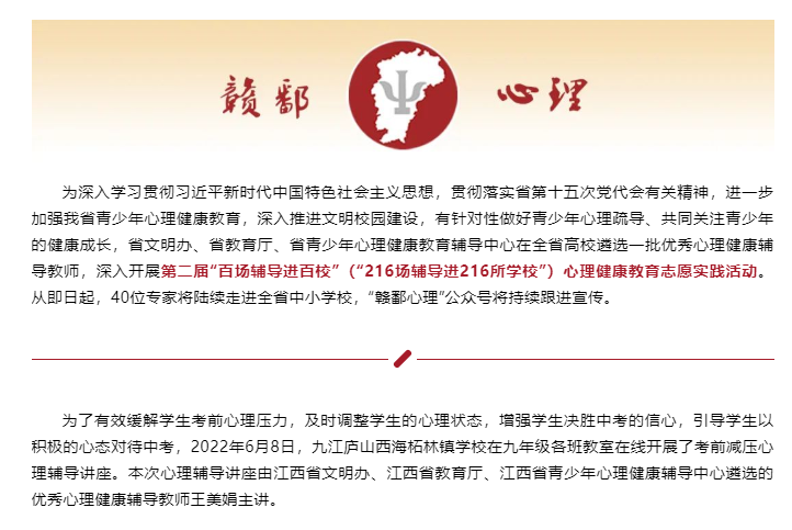 由江西省文明办、江西省教育厅主办的赣鄱心理公众号宣传报道了beat365官网大学生心理健康教育中心负责人兼基础教育学院副书记、副院长王美娟参与“百场辅导进百校”心理健康教育志愿实践活动的事迹,全文如下。