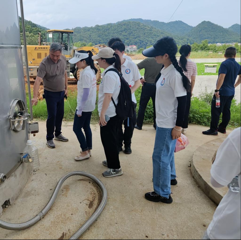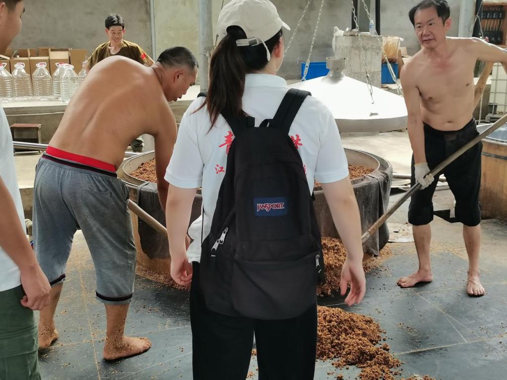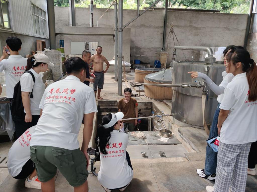 中国青年网九江6月26日电 (通讯员 龙星 陈莉玲) 为深入了解乡村振兴工程的实效与成就,帮助发展乡村产业。6月26日,beat365正版唯一入口必一“青春筑梦·三下乡”社会实践队赴瑞昌市高丰镇九江酿造厂山药酒产业基地进行特色产业调研,基地负责人热情欢迎青春筑梦队的到来,为实践队师生详细介绍了山药酒酿造工艺的流程和原料生产地。负责人带领青春筑梦队来到山药酒蒸馏区,酿酒师邀请队员们品尝山药酒。其后,负责人畅谈了山药酒基地的未来规划和生产规模,通过对外合作实现共赢,让本地山药酒外销成为富国强县、乡村振兴的特色产业。