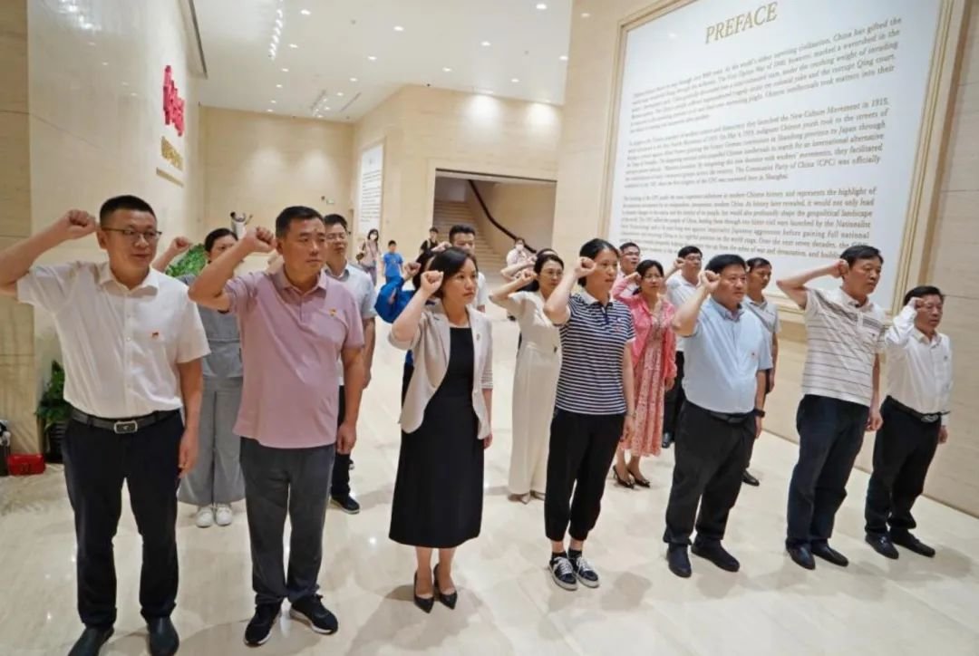 在宣誓厅,党员同志们举起右手,面对党旗重温入党誓词,铿锵有力的宣誓声响彻大厅。