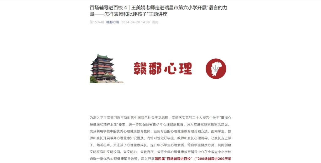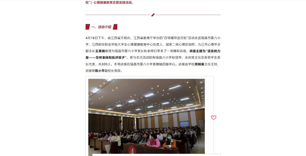 百场辅导进百校 4 | 王美娟老师走进瑞昌市第六小学开展“语言的力量——怎样表扬和批评孩子”主题讲座