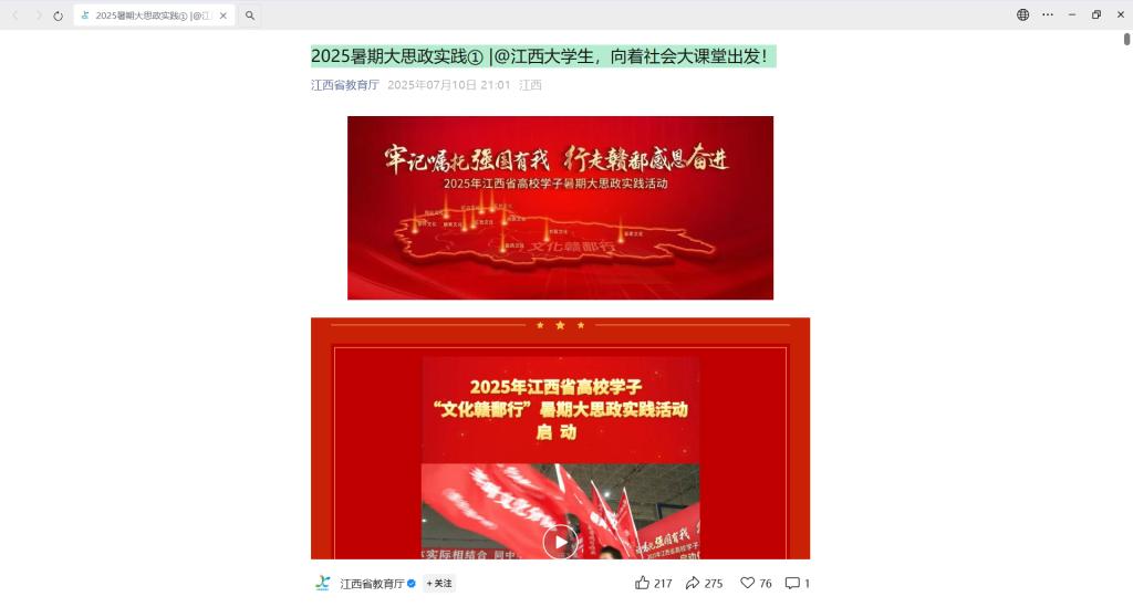 (江西省教育厅)2025暑期大思政实践① |@江西大学生,向着社会大课堂出发!