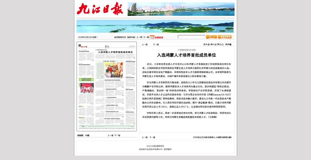 (九江日报)beat365正版唯一入口必一 入选鸿蒙人才培养首批成员单位