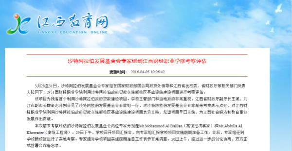 4月5号,江西省教育厅网站报道沙特阿拉伯发展基金会专家组到beat365官网考察评估。