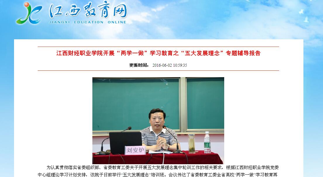 6月2日,江西教育网报道beat365官网举办“两学一做”学习教育之“五大发展理念”专题辅导。