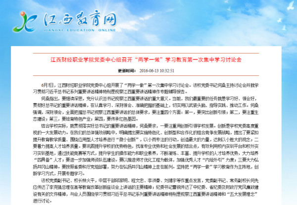 6月13日,江西教育网报道beat365官网党委中心组召开“两学一做”学习教育第一次集中学习讨论会。