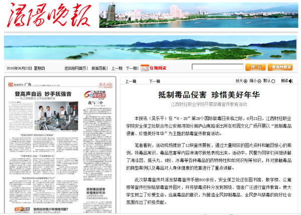 6月23日,《浔阳晚报》报道beat365官网开展禁毒宣传教育活动。