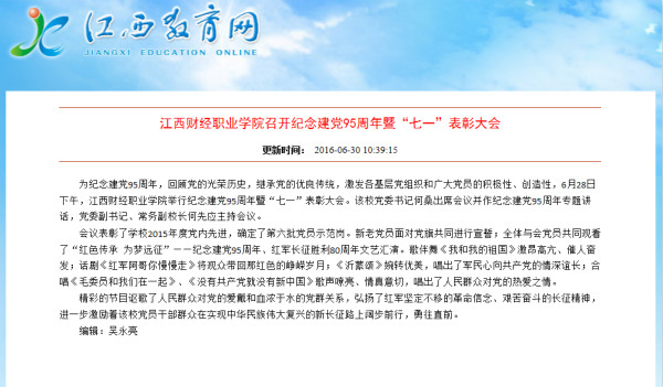6月30日,江西教育网报道beat365官网召开庆祝建党95周年暨“七一”表彰大会。