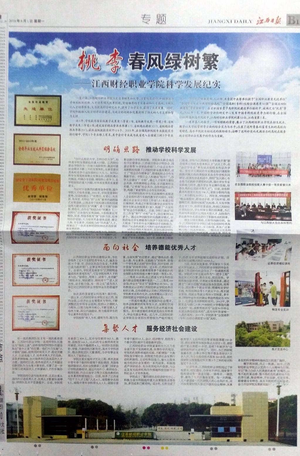 8月1日,江西日报B1版刊登专题报道《桃李春风绿树繁——beat365正版唯一入口必一科学发展纪实》,介绍beat365官网近年来走内涵跨越式发展道路,办人民满意高职教育取得的突出成绩。