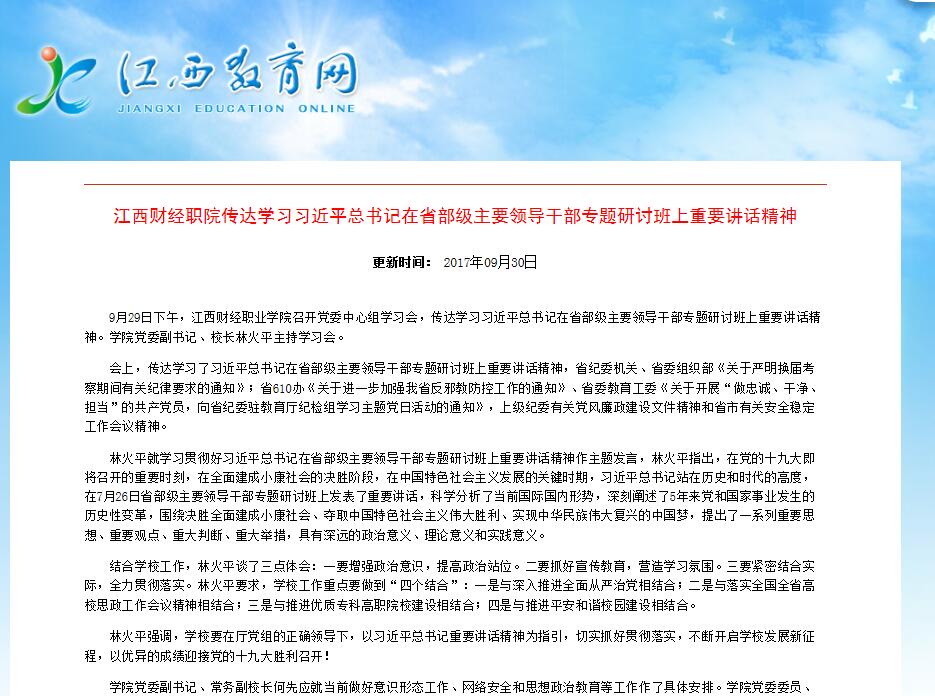 江西教育网:江西财经职院传达学习习近平总书记在省部级主要领导干部专题研讨班上重要讲话精神