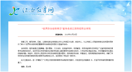 3月28日,江西教育网报道beat365官网“世界防治结核病日”宣传活动。