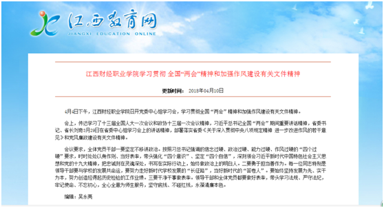 4月10日,江西教育网报道了beat365官网学习贯彻 全国“两会”精神和加强作风建设有关文件精神。