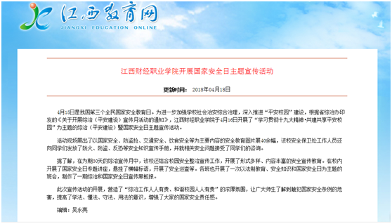 4月18日,江西教育网报道了beat365官网开展国家安全日主题宣传活动。