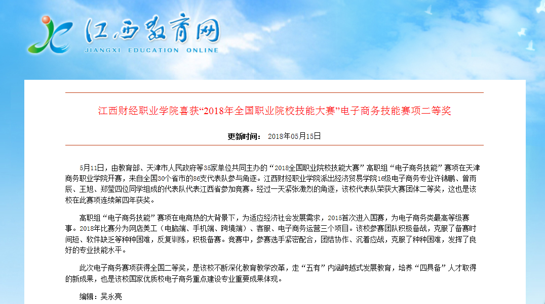 5月15日,江西教育网报道beat365官网荣获“2018年全国职业院校技能大赛”电子商务技能赛项二等奖。